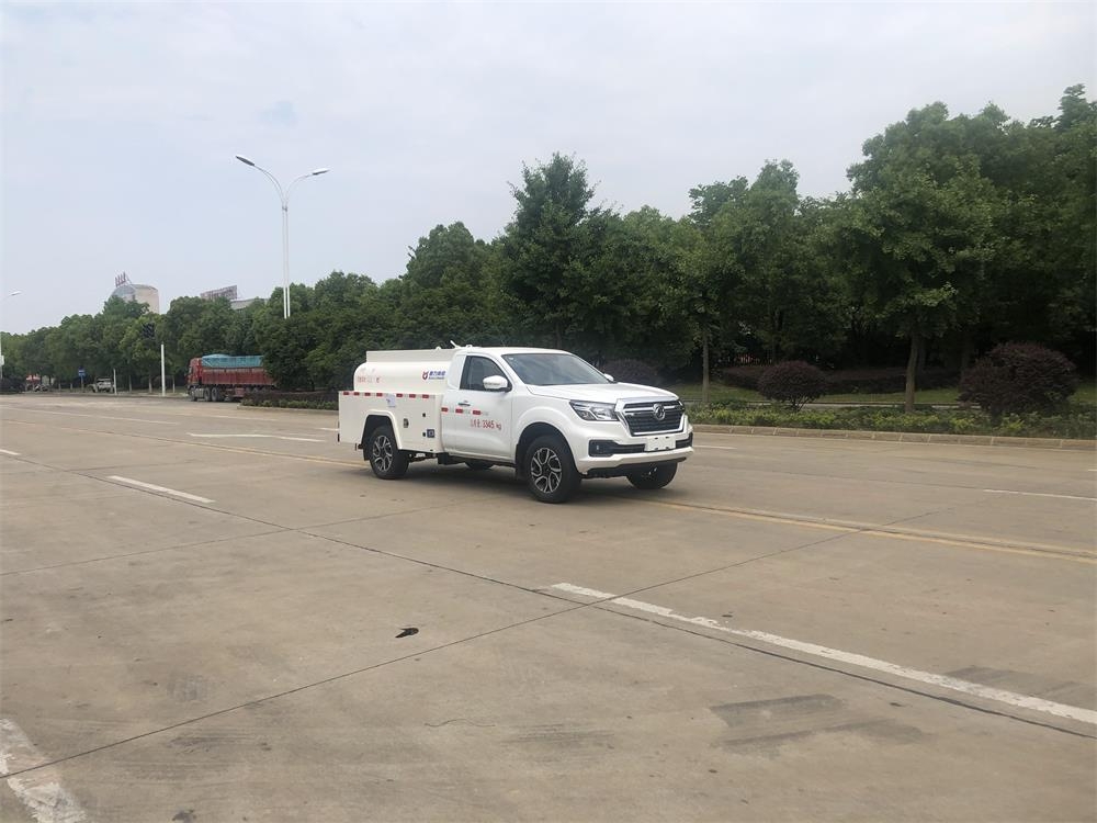 總質量:3345KG,額定載:1100KG,整備質量:2115KG;罐體容積 1.2m3,罐體采用優質碳鋼(3mm)焊接制作,封頭自動焊,拼板自動焊,罐內裝有防浪板,配備 40/50 灑水泵,配后灑陀。65三通球閥、65兩通球閥、三通濾網、消防水口、吸水口各 1 個。罐體左右兩側優質碳鋼板裙邊,罐體尾部仿罐體外形工具箱一個,工具箱底部花紋鋁板